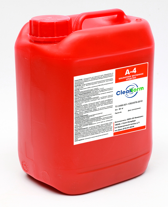 Высококонцентрированное кислотное жидкое низкопенное средство для промывки оборудования, на предприятиях пищевой и перерабатывающей промышленности.